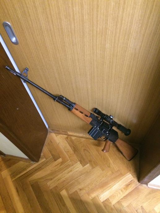 Prodaje se poluautomatska snajperska puška iz opisa. Iz puške je rijetko pucano, tako da je ista u odličnom stanju. Bez ikakve hrđe, cijev dobra. Prošle godine je puška generalno uređena. Kundak je isto nanovo obnovljen i prelakiran. Može se registrirati za lov, pošto puška ima spremnik ograničen na 2 metka sa odgovarajućom potvrdom ovlaštene puškarske radionice. Uz pušku se kao što je vidljivo na slici dobiva originalna optika ZRAK 4x32 uz pripadajući nosač. Uz pušku imam nešto metaka za prodati po povoljnoj cijeni. Cijena 5200.- KN.