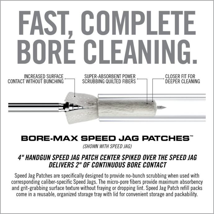 Bore-Max Speed Jag zakrpe su komponenta Bore-Max Speed Clean sustava za brže i lakše čišćenje cijevi. Dimenzionirane tako da precizno odgovaraju promjeru nazubljenja i debljini zakrpe, ova kombinacija pruža optimalnu kompresiju za temeljito i dosljedno dosezanje do utora i žljebova. Dovoljno su čvrste da osiguraju vrhunsku kompresiju unutar cijevi, a istovremeno ostaju relativno jednostavne za probijanje. Speed Jag i Patch sustav ubacuju više materijala za zakrpe u cijev, eliminiraju nakupljanje i maksimiziraju učinkovitost svakog prolaska. Speed Patches su sintetički materijal koji je pokazao superiorniju upijajuću moć u odnosu na pamuk i bolji je u upijanju onečišćenja i istrošenog otapala u cijevi. Površina s teksturom nalik prošivenom učinkovitije skuplja i hvata prljavštinu dok prolazi kroz cijev bez habanja ili ispuštanja dlačica.