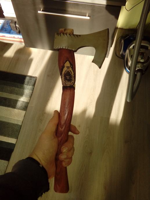 Odlična mala sjekirica za dar ili ljubitelje hladnog oruzja, rucni rad, jedinstvena i unikatna. Sa urezanim morskim psom, sjecivo je pravo kovano.