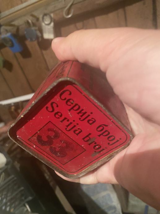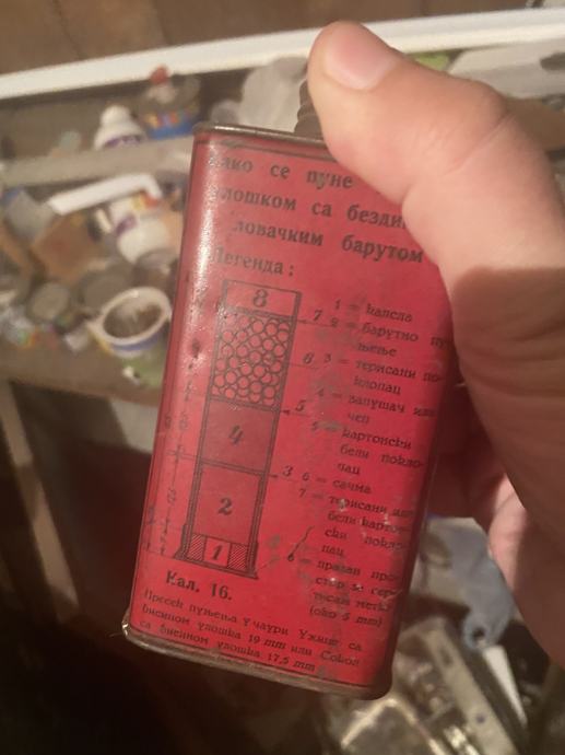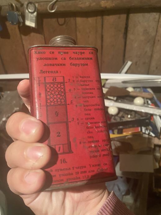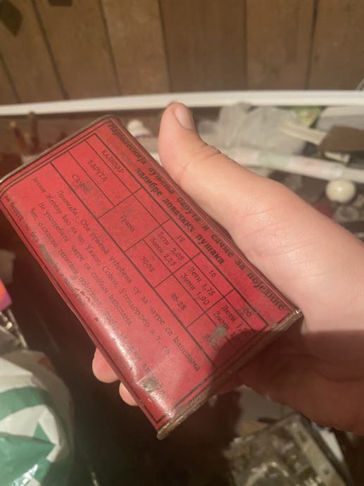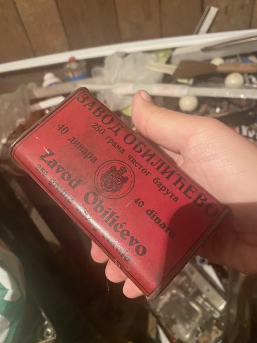 Stara kutijica baruta, originalna ambalaža. U kutiji je vrlo vjerojatno stara lovačka sačma, kuglice, s obzirom da je sve bilo u posjedu jednog lovca. Stoji u šupi 40-ak godina.