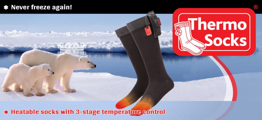 Hlade li vam stopala i nožni prsti dok ste vani zimi? Konačno postoji rješenje za ovaj problem! TERMO ČARAPE, naše nove grijane čarape s integriranim grijaćim elementima koji potpuno okružuju nožne prste. Traka za podešavanje na čičak, koja drži torbicu za bateriju s integriranim gumbom za kontrolu temperature, može se pričvrstiti ili na listove ili na bedra nogu. Opsežna ispitivanja tijekom proteklih godina su pokazali da područje grijanja koje pokriva nožne prste ima najveći učinak na održavanje stopala toplim. Proširenje područja grijanja na cijeli donji dio stopala zapravo bi uzrokovalo pregrijavanje i presperaciju.
