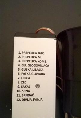 Elektronska vabilica (12V) sa 12 zvukova životinja, jednostavna za korištenje, sa kotačićemm birate zvukove. Na trećoj slici je popis zvukova koji se nalaze na vabilici. Mogući i zvukovi drugih ptica (liske, jarebice i dr.). Uz vabilicu dolazi i daljnski upravljač za paljenje/gašenje (npr. kod vabljenja predatora za naizmjenično puštanje zvuka).