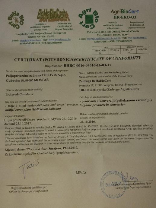 Prodajemo vrhunsko eko ulje smilja s certifikatom (foto). Istaknuta cijena je za 5ml. Veće količine prema dogovoru.
