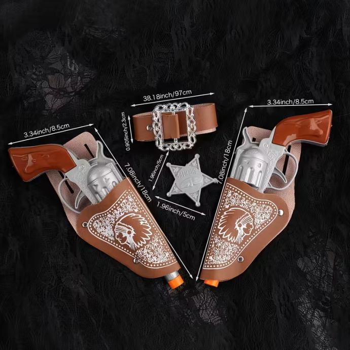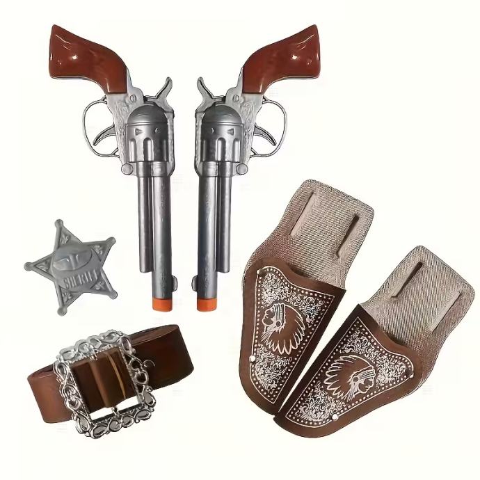 Set od 6 pištolja u western stilu s futrolom i remenom - nefunkcionalna replika pištolja, patrone u obliku metka, zvjezdasta kopča i ukrasi sa šljokicama - savršeno za western igranje uloga, Noć vještica, božićne poklone - idealno za kolekcionare i ljubitelje rekvizita - uključuje