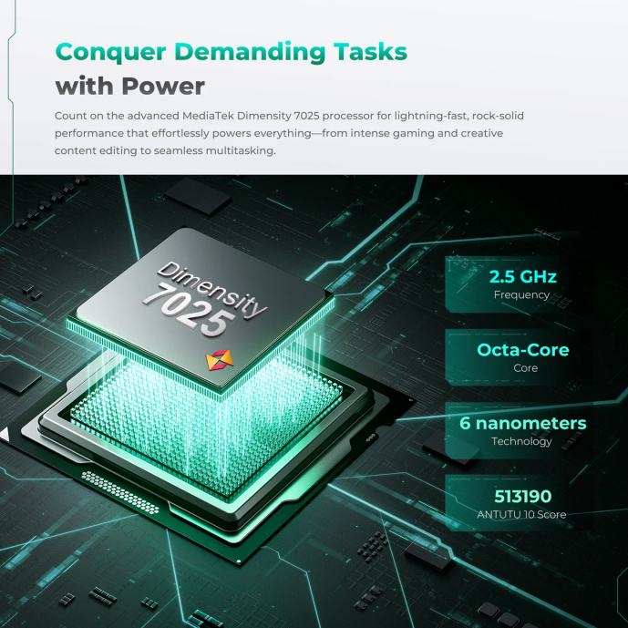 S prednje strane nalazi se veliki 6,6-inčni zaslon s 120 Hz osvježavanjem, koji osigurava glatko skrolanje, ugodno gledanje multimedije i dobru čitljivost u svakodnevnom radu. Ispod haube radi MediaTek Dimensity 7025 5G, osmojezgreni procesor izrađen u 6 nm procesu, uparen s ž16 GB RAM-a (uz virtualno proširenje do 48GB RAM-a) i do 512 GB interne memorije, uz mogućnost proširenja microSD karticom. Performanse su stabilne, aplikacije se brzo otvaraju, a multitasking funkcionira bez trzanja.