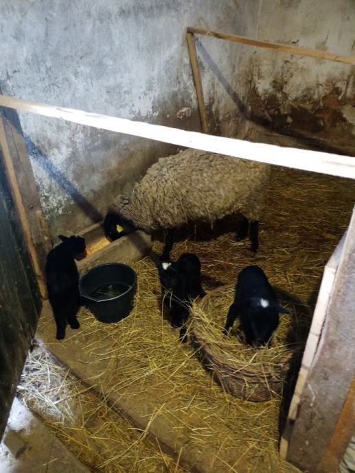 Ovca Romanovske pasmine, drugo janjenje s tri janjeta starosti tri tjedna, već pomalo jedu šrot i sjeno! Šandrovac kod Bjelovara!