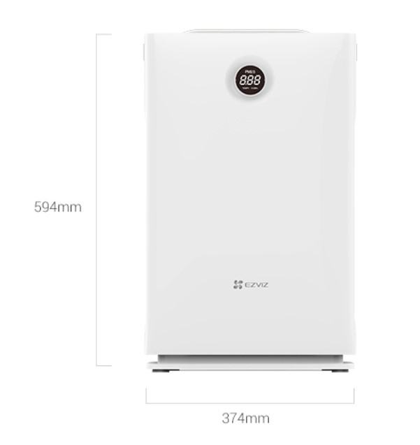EZVIZ UV-C pročišćivač zraka, CS-EB-FILTER001, 4 razine filtracije: predfilter, HEPA filter, filter s aktivnim ugljenom i UV-C svjetlo koje ubija viruse i bakterije, kapacitet 350 m3/sat, za prostorije do 42 m2, digitalni displej s prikazom razine čestica u zraku, vlažnosti i temperature prostorije, pokazatelj zamjene filtra, tri načina protoka zraka, tajmer za uključivanje / isključivanje, dimenzije: 374 × 215 × 594 mm, 6.88 kg.