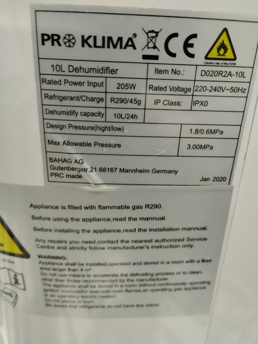 Prodaje se malo rabljeni Proklima odvlaživač zraka, za isušivanje vlage iz prostora te izbjegavanje problema s kondenzacijom, plijesni i neugodnim mirisima. Naročito je pogodan u kupaonicama, podrumima, kuhinjama i slabo prozračenim prostorijama. Odvlaživač zraka ima kapacitet odvlaživanja do 10 litara /24 h.
