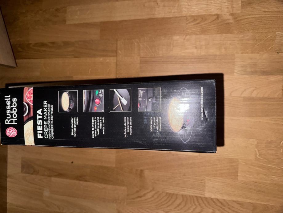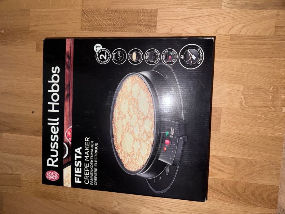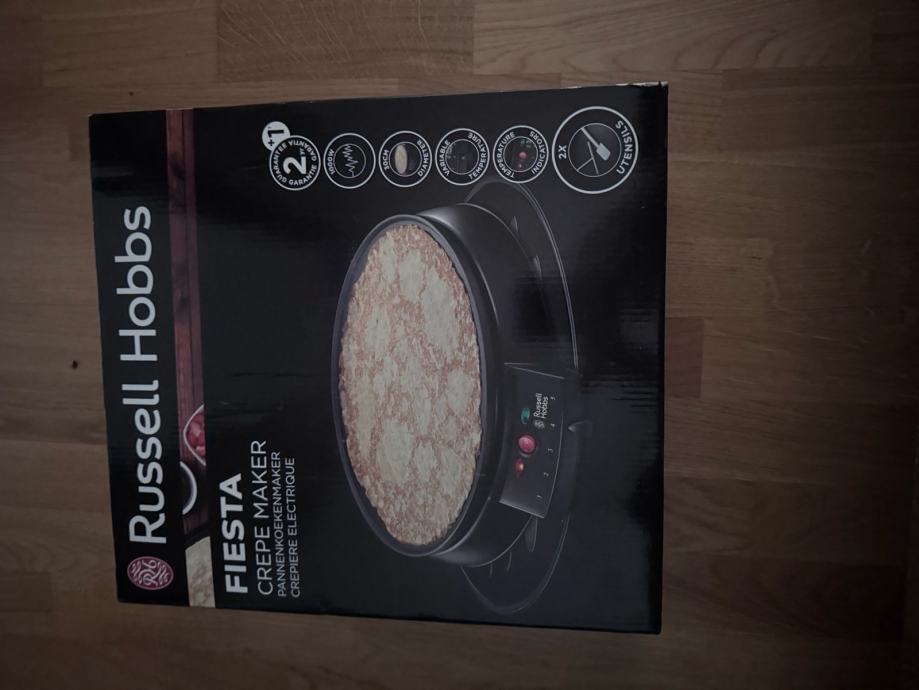 Prodajem nov Russell Hobbs Fiesta aparat za palačinke, tvornički zapakiran. Radi se o modelu namijenjenom pripremi tankih palačinki (crêpes), s okruglom pločom i regulacijom temperature. Aparat je crne boje i dolazi u originalnom pakiranju. Neotvoren.