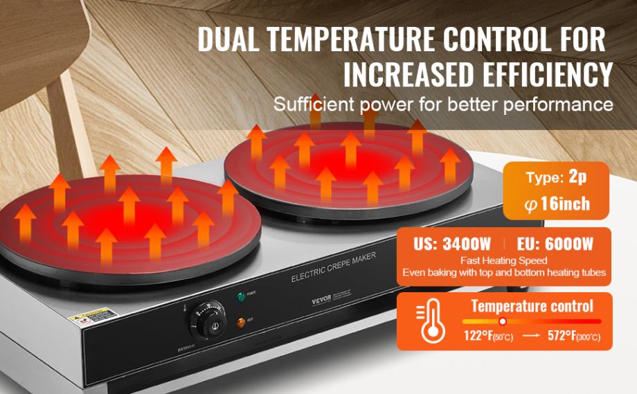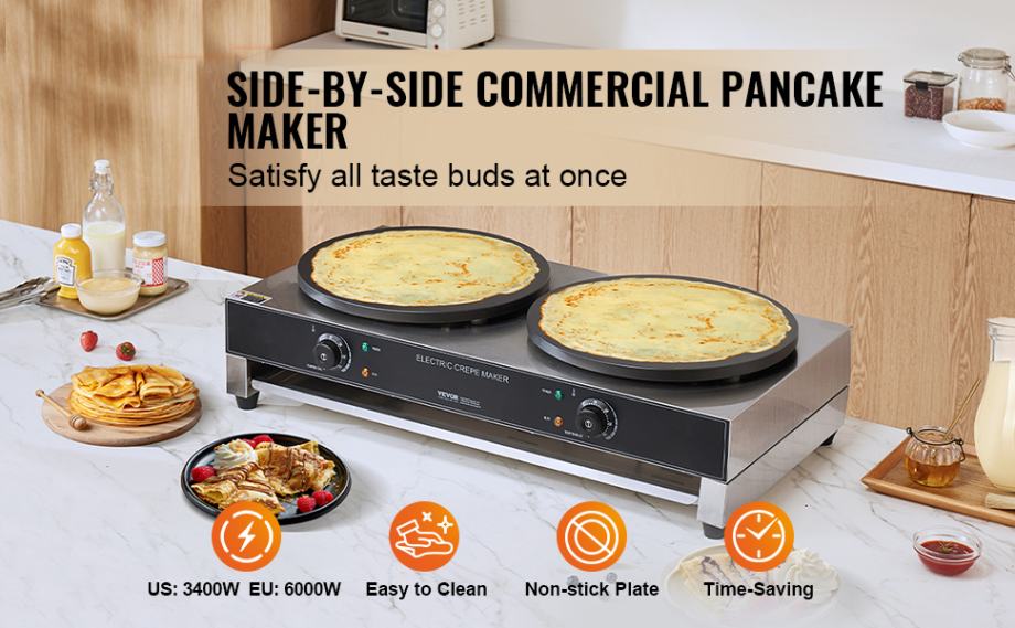 Električni aparat za palačinke od 3400 W ima dvije velike grijaće ploče promjera 400 mm (16 inča), što olakšava pripremu ukusnih vafla i štedi vam značajnu količinu vremena, pružajući vam iskustvo doručka bez napora. Ravnomjerno raspoređeni grijaći elementi osiguravaju da su vaši vafli ravnomjerno pečeni. Pripremite se za uživanje u vaflima punjenim vašim omiljenim nadjevima.