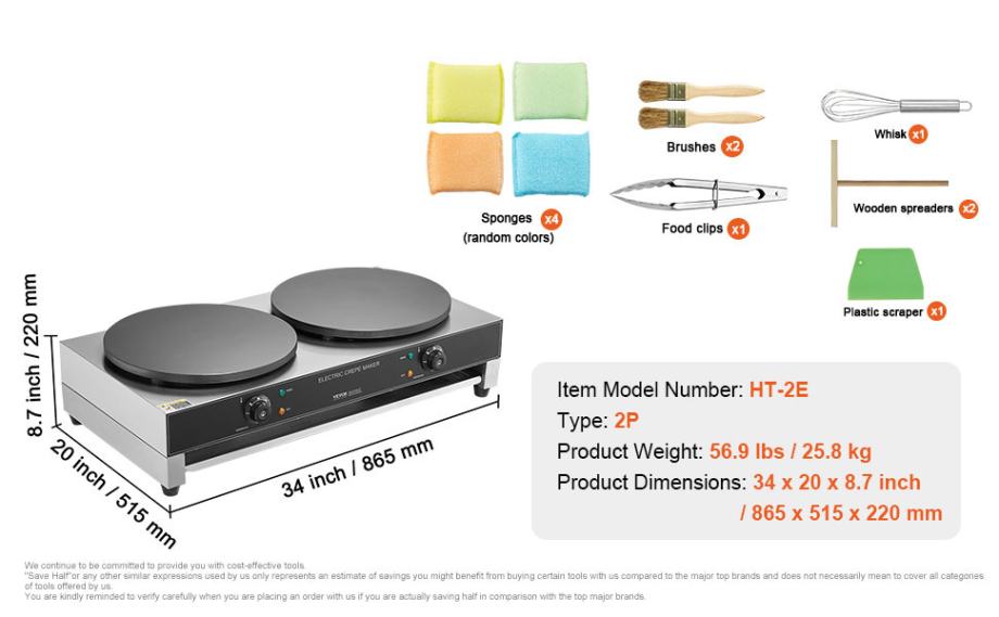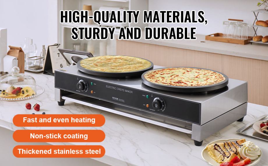 Izrađen od nehrđajućeg čelika, s četiri gumene nožice na dnu za bolju stabilnost tijekom rada i održavanje ravnoteže. Ovaj stroj za palačinke također dolazi opremljen raznim dodacima koji pomažu pri pečenju.