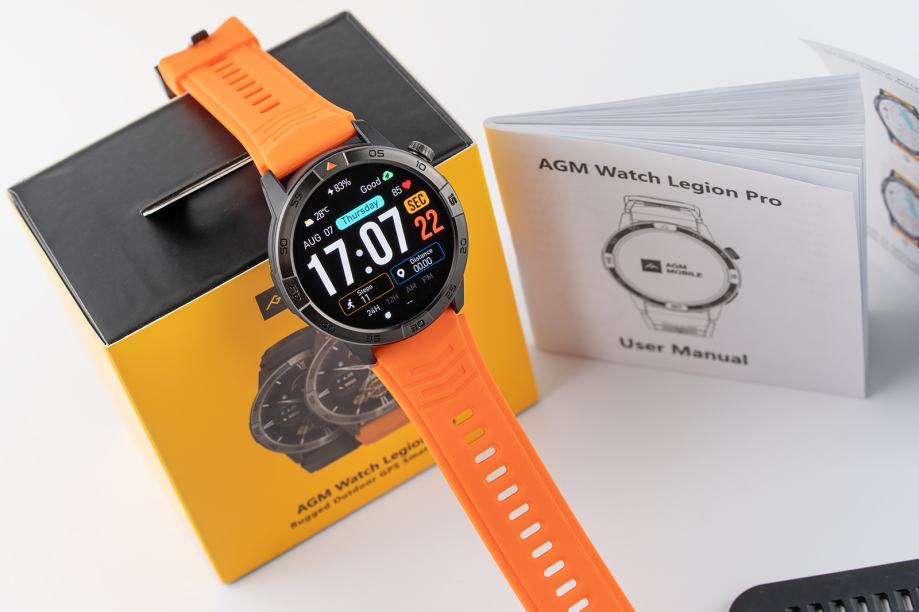 Prodaje se AGM Legion Pro smartwatch dolazi s 1.43-inčnim AMOLED zaslonom (60Hz, 600 nita), integriranim GPS-om s offline kartama, barometrom, altimetrom i kompasom, MIL-STD-810H vojnom certifikacijom, 5 ATM vodonepropusnošću do 50 metara, podrškom za 100+ sportskih aktivnosti, Bluetooth pozivima i baterijom od 370mAh. U paketu se nalazi sam sat, magnetski punjač s dva pina, korisnički priručnik na više jezika te dvije zamjenske narukvice – neon narančasta i crna.
