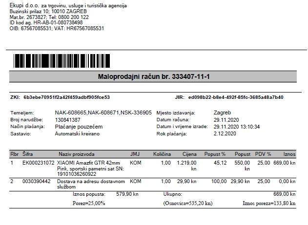 Uz njega se dobije u kutiji jamstvo, upute, kabel za punjenje i račun u PDF obliku jer je kupljeno preko eKupi.