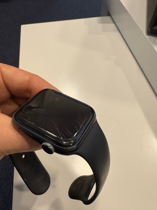 Prodajem Apple Watch Series 6 44mm pametni sat u crnoj boji s crnom sportskom narukvicom. Sat je u funkcionalnom stanju, a ekran ima vidljiva oštećenja stakla koja ne ugrožavaju funkcionalnost. Kućište od aluminija i silikonska narukvica su očuvani. Sat uključuje sve osnovne funkcije poput mjerenja otkucaja srca, praćenja aktivnosti i notifikacija. Radi bez problema. Baterija drži cijel idan. Prodaje se s originalnim kabelom za punjenje.