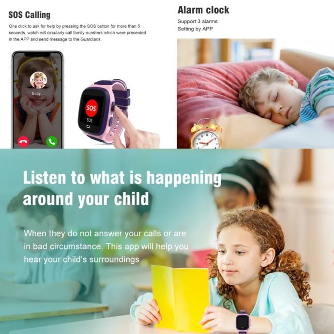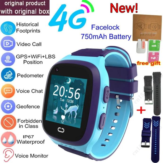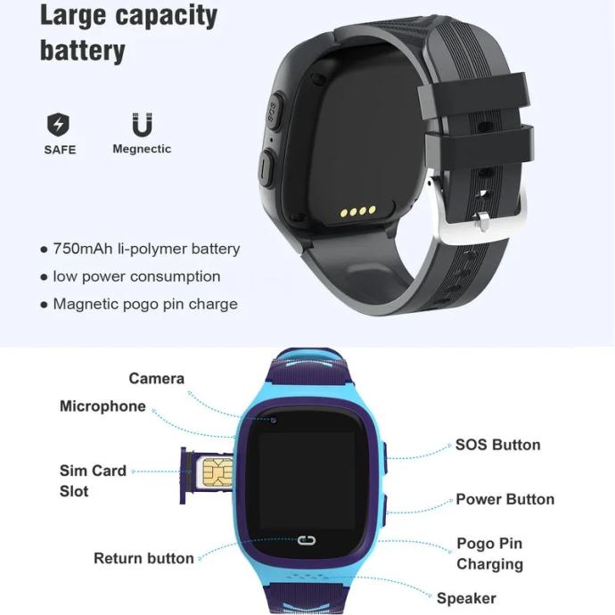 4G mreža: GPS+ WIFI+LBS pozicioniranje, nano SIM kartica, pozivi, video pozivi, SOS tipka za zvanje predefiniranog broja, udaljeni nadzor, WiFi, točnije lociranje, memorija RAM:2GB, ROM:4GB, baterija Lithium 750mAH, IP67 vodootporan nije za plivanje niti za slanu ili vruću vodu, ekran IPS 1.4" HD 240*240 rezolucije, pedometar, kamera, video pozivi, glasovni chat, alarm, daljinsko upravljanje preko aplikacije Setracker.