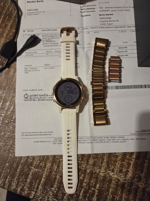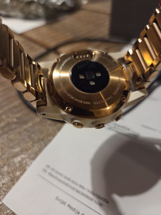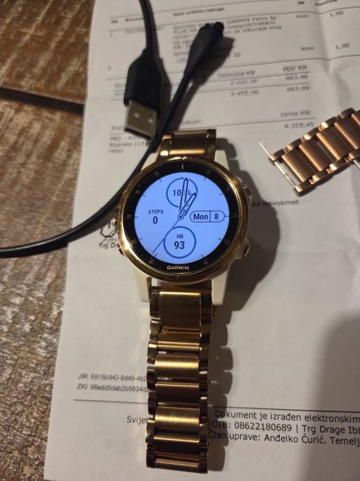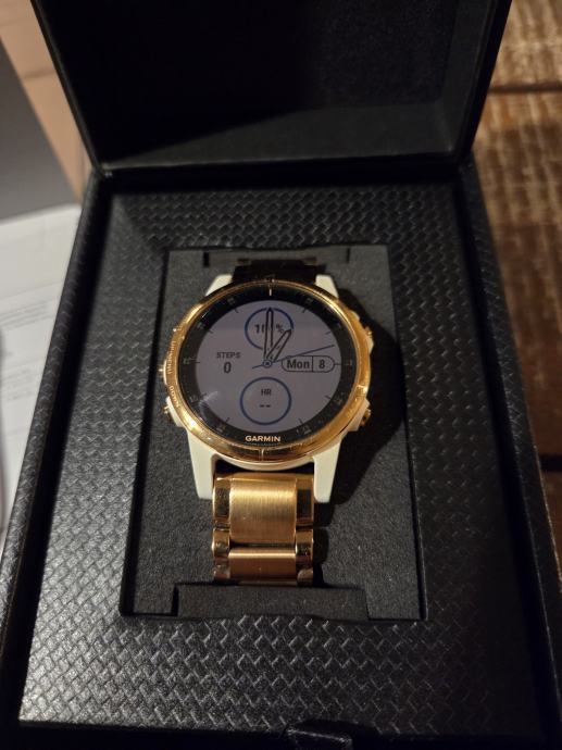 Prodajem Garmin Fenix 5S Plus Sapphire pametni sat u zlatnoj boji. Sat dolazi s orginal Garmin metalnom narukvicom u istoj boji, i orginal Garmin silikonskom bijelom narukvicom.