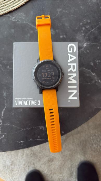 Prodajem Garmin Vivoactive 3 pametni sat s narančastim silikonskim remenom i tamnim kućištem. Sat dolazi s originalnom kutijom.