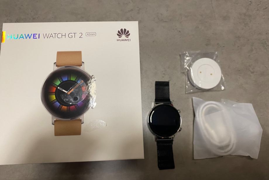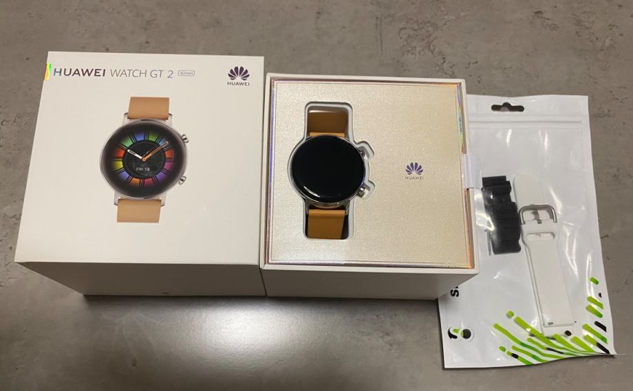 Prodajem pametni sat Huawei Watch GT2 42mm Classic, srebrne boje, potpuno ispravan u odličnom stanju, baterija drži do 6 dana ovisno o načinu korištenja, na staklu zanemarivi tragovi korištenja, original kutija i punjač sa kabelom, original Huawei smeđa kožna narukvica nikad korištena, gumena bijela i metalna crna narukvica gratis.