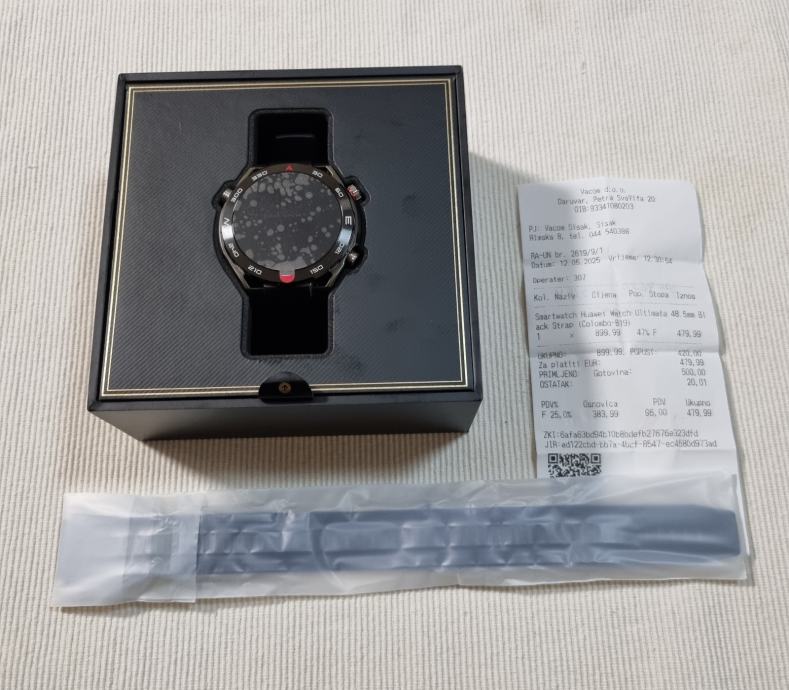 Dolazi s crnim i plavim zapakiranim pripadajućim remenom, računom, punjačem i kutijom.
