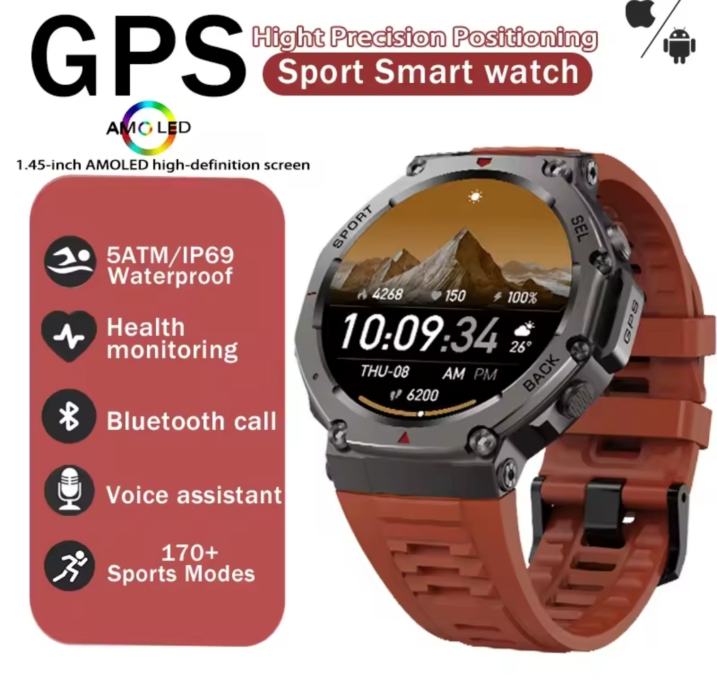 Prodajem GPS pametni sat s 1,45-inčnim AMOLED ekranom visoke rezolucije. Sat ima vodootpornost 5ATM/IP69, što znači da se može koristiti pri plivanju i tuširanju. Opremljen je GPS-om za precizno praćenje lokacije, zdravstvenim praćenjem uključujući mjerenje pulsa, Bluetooth pozivima, glasovnim asistentom te podrškom za preko 170 sportskih načina rada.