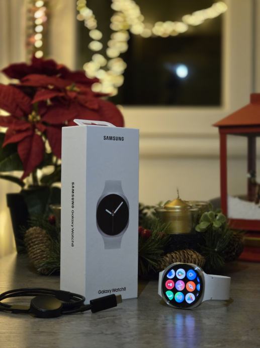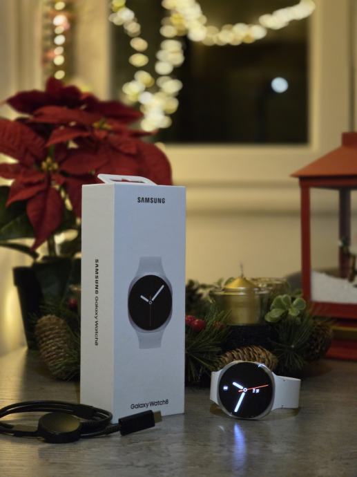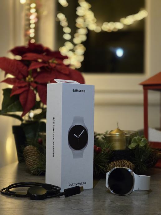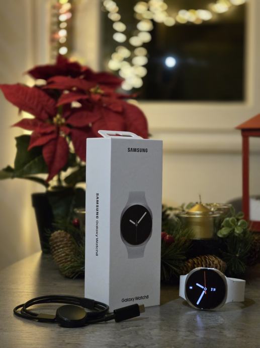 Prodajem novi, samo otvoreni Samsung Galaxy Watch 8 44 mm srebrne boje s bijelim remenom.