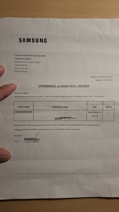 Prodajem Samsung Galaxy Watch FE (2024) koji je u originalnom pakiranju. Uz sat dolazi i originalna otpremnica Samsung Electronics Austria-Zagreb, što potvrđuje porijeklo proizvoda.
