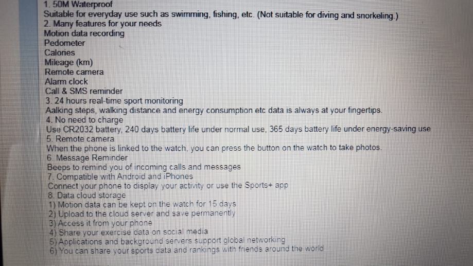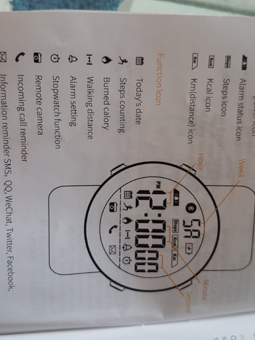 Ima funkcije potrošnja kalorija, brojač koraka, mjerenje pređenog puta, spajanje na mobilni uređaj preko bluetootha, alarm, kalendar, štoperica, upravljanje kamerom, prikaz broja pozivatelja, analiza svih performansi, vodootpornost IP68 (5ATM), prikaz na mobitelu preko Sports + app aplikacije. Baterija 12 mjeseci aktivnosti.
