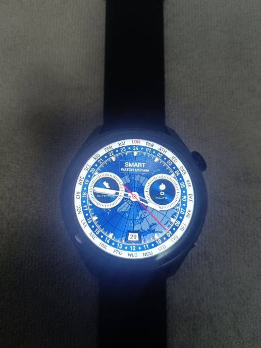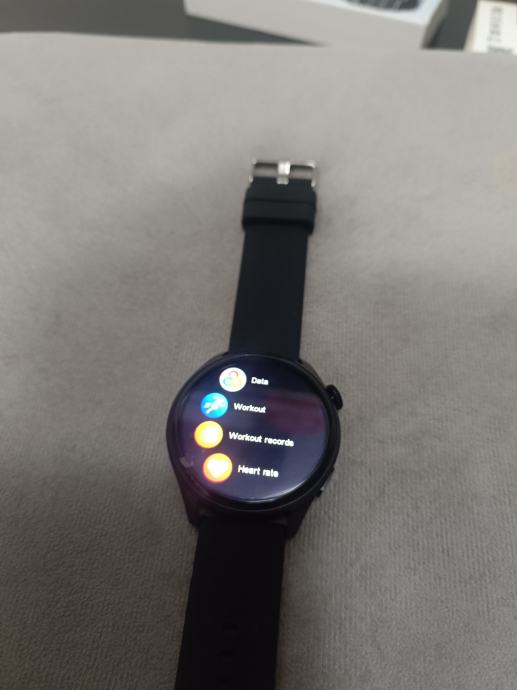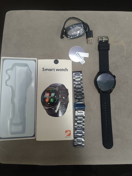 SmartWatch sat crne boje sa crnim gumenim remenom uz to dolazi punjač i metalna narukvica koja se mijenja vrlo lako.