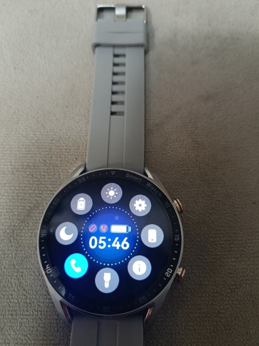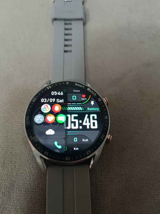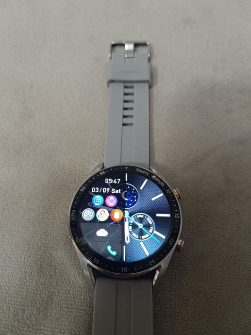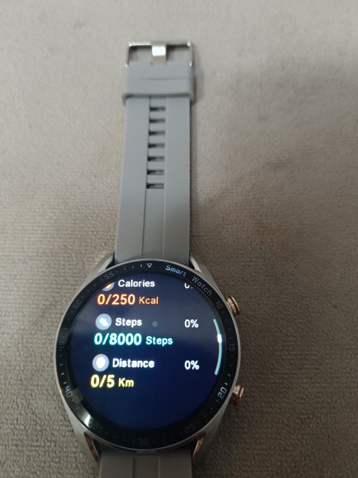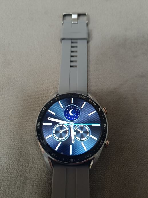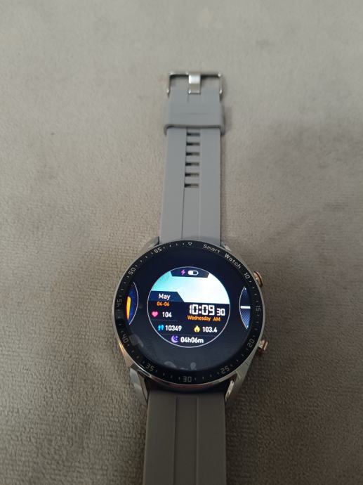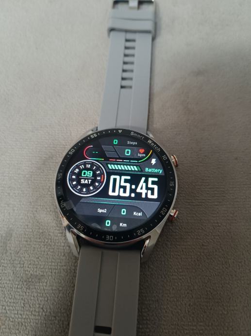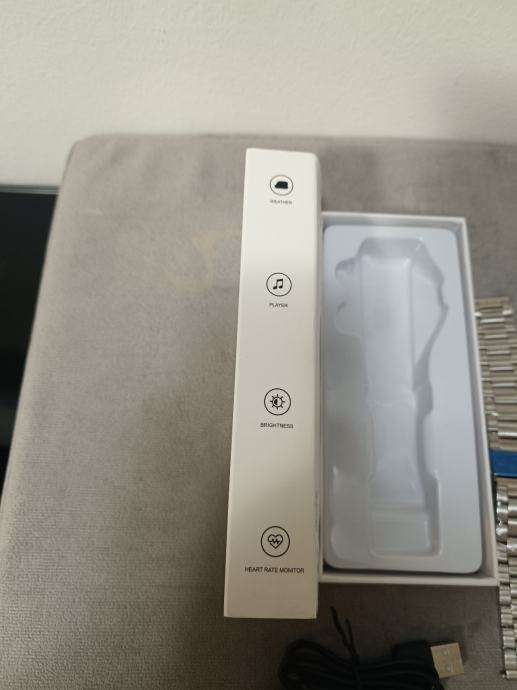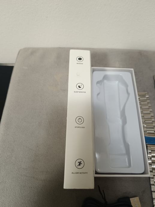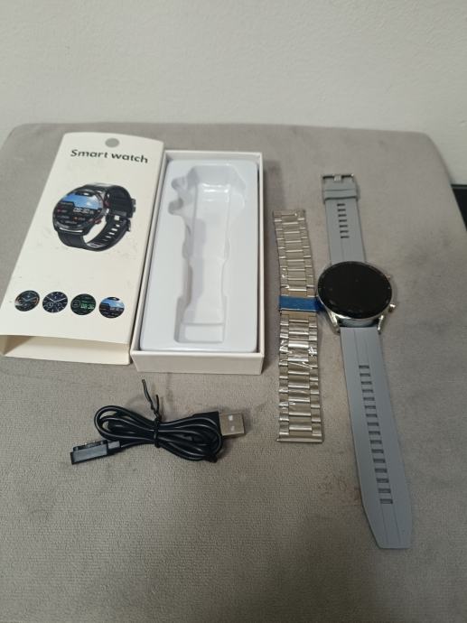 Srebrni sat koji dolazi sa punjačem, sivom gumenom narukvicom i dodatnom srebrnom metalnom uz izuzetno laganu zamjenu.