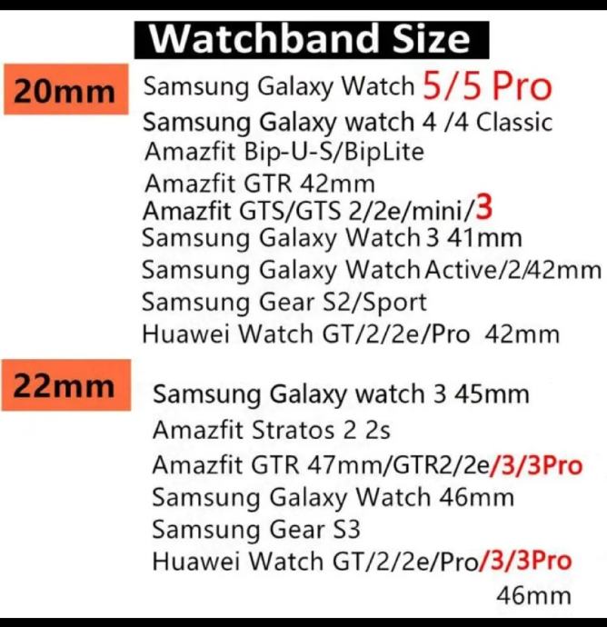 SAMSUNG, AMAZFIT, HUAWEI, te UNIVERZALNE NAMJENE ZA SVE PAMETNE SATOVE KOJI IMAJU KONTAKTNI ŠTIFT/METALNU IGLU, kojim se spaja remen sa kućištem sata, a promjera su