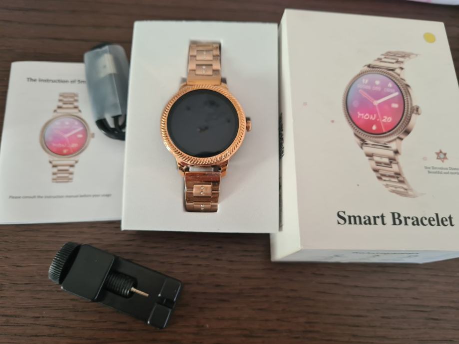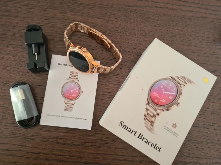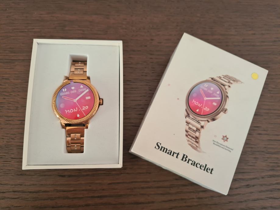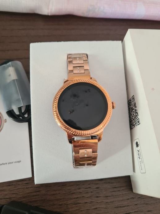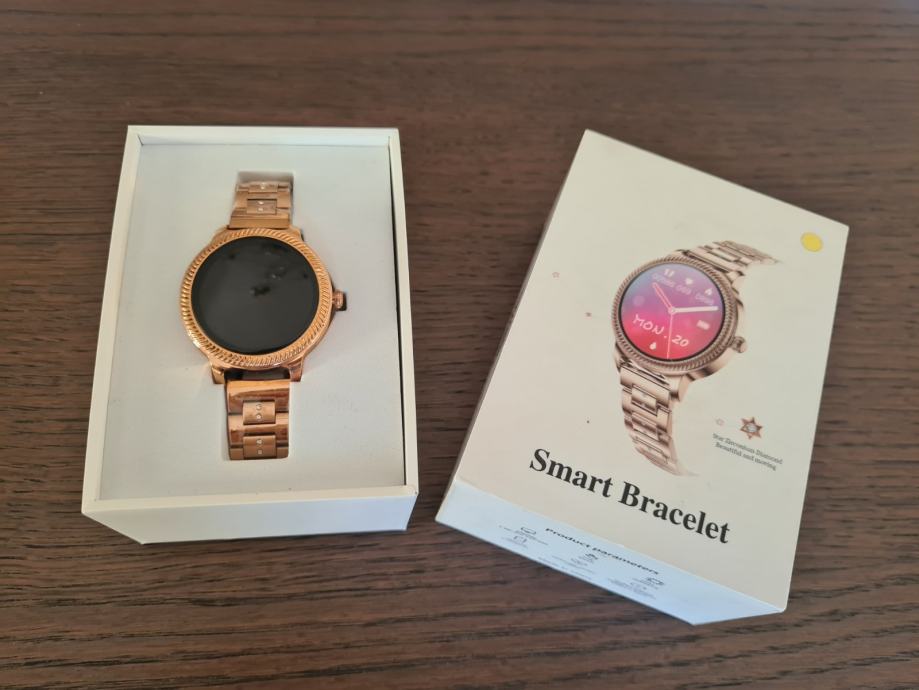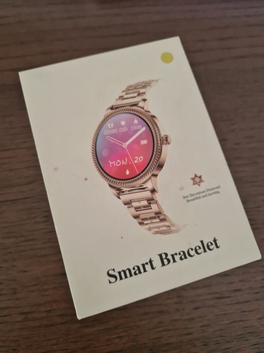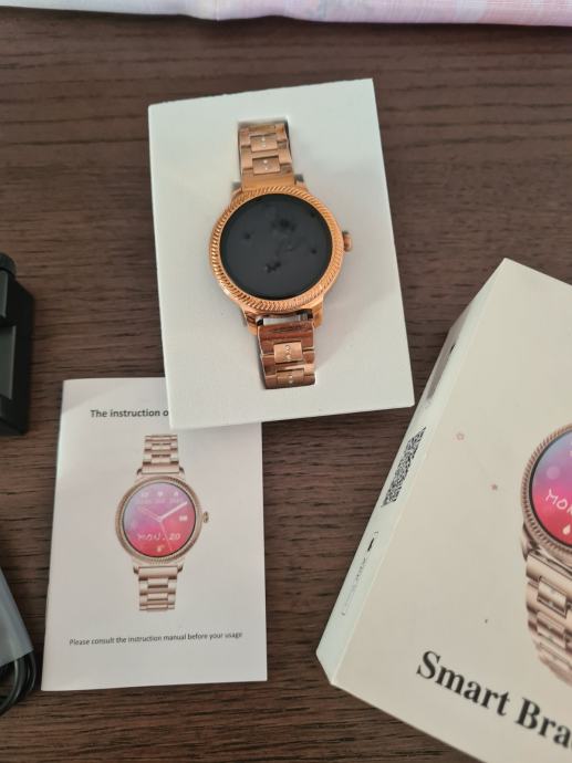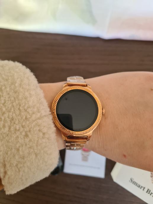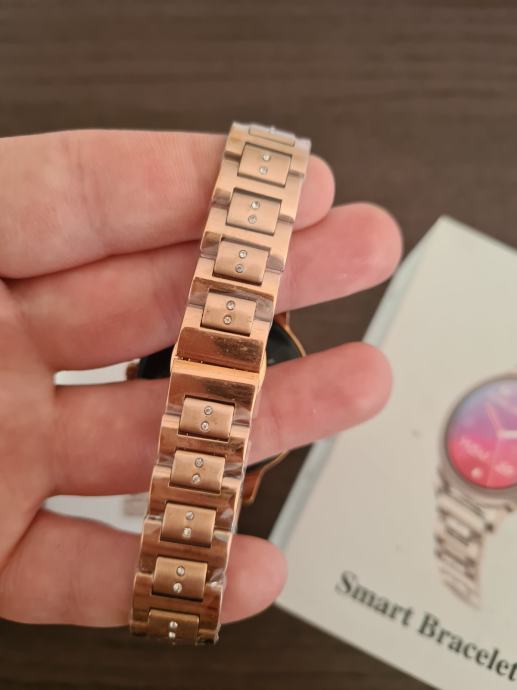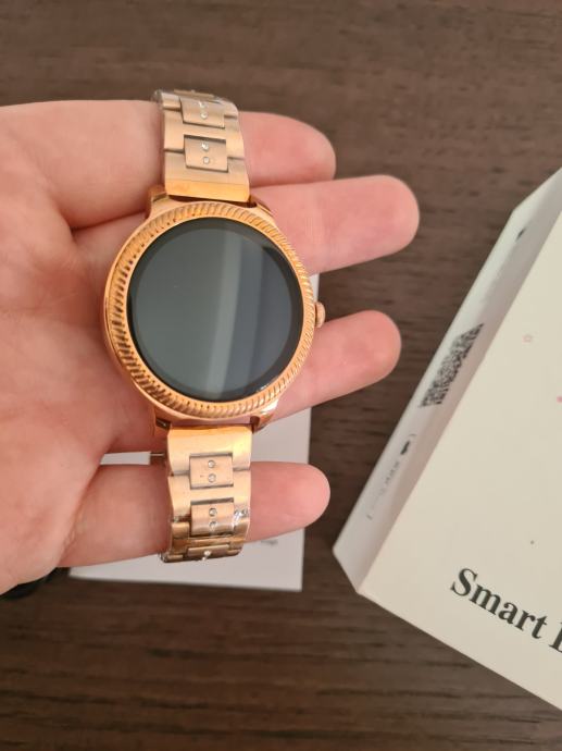 - prodajem novi zlatni model smartwatcha za žene sa metalnim nehrđajučim remenom i kućištem i cirkonima po remenu