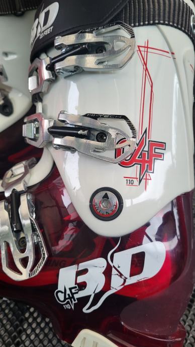 Prodajem rabljene BOOT DOC C4F 110 pancerice za skijanje u crveno-bijeloj boji. Pancerice su u korištenom stanju s vidljivim oznakama BD na vanjskom dijelu. Idealne za rekreativne skijaše koji traže udobnost i dobru kontrolu.