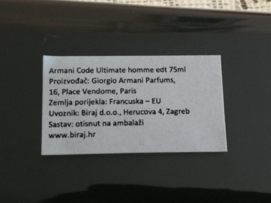 Prodajem original muški, novi parfem ARMANI code ultimate 75ml sa računom, kupljen u "biraj.hr"
