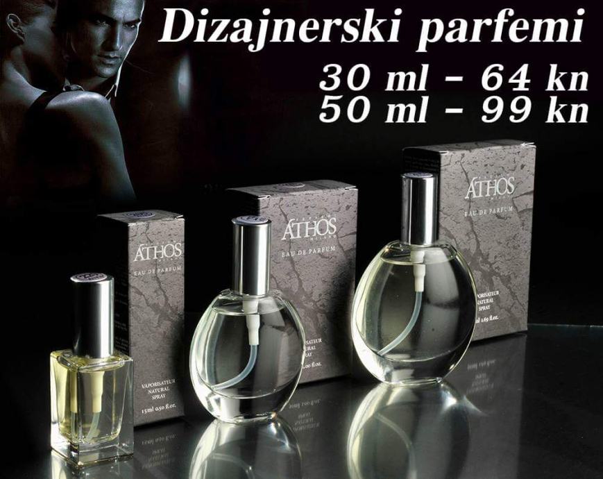 Athos parfemi su pakirani u tri veličine bočica i to od 15 ml, 30 ml i 50 ml. Svi su pakirani u Athos ambalaži kako kupac ne bi plaćao skupu ambalažu koja mu ničemu ne koristi (kada kupujete parfem najveći dio cijene je ambalaža i marka), a kvaliteta i miris su originalni.