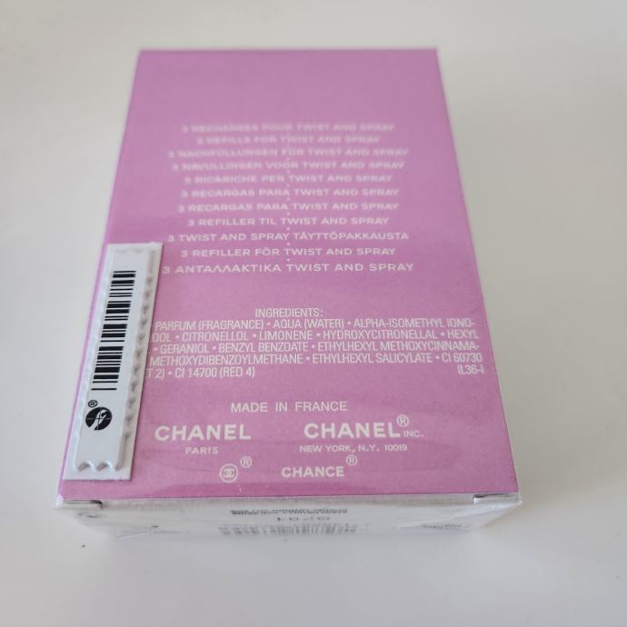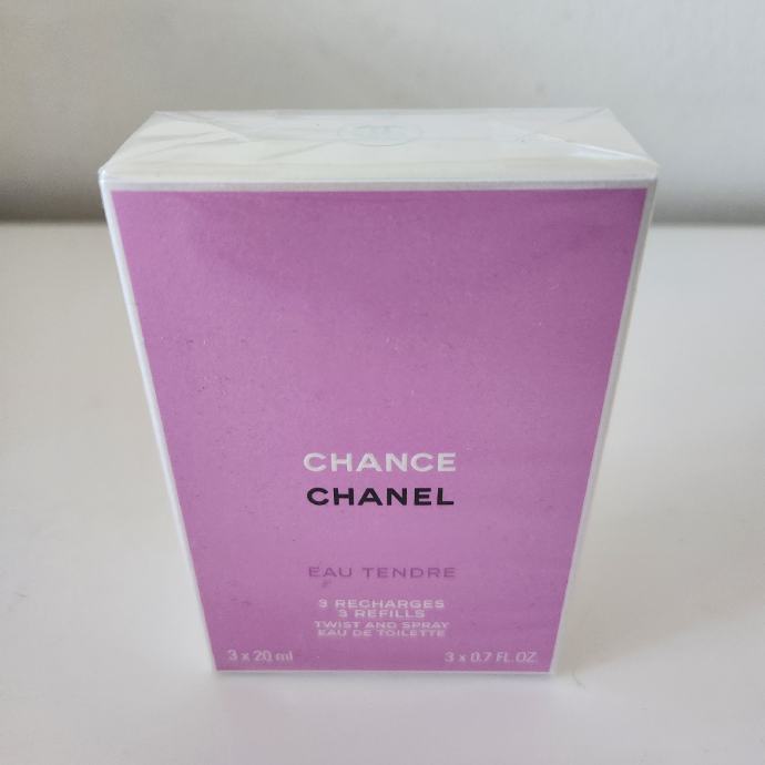 Prodajem novi i zapakiran original Chance Chanel - Eau Tendre - 3 Refills / 3 Recharges - Twist Spray - Eau de Toilette od 3x20mL, odnosno 60mL.