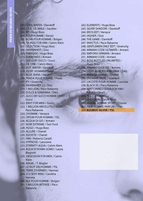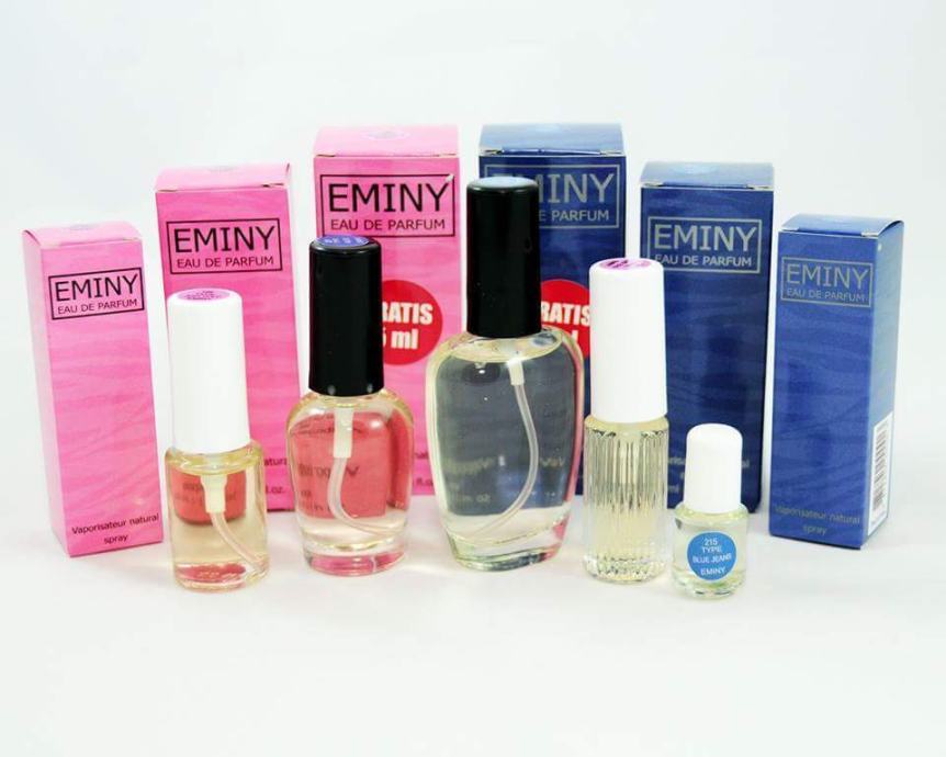 Naši parfemi su originalnog sadržaja u našoj EMINY ambalaži.Svi parfemi su eau de parfume što znači da ženski parfemi u sebi imaju 16%,a muški 14% parfemskog ulja te su zbog toga izuzetno postojani.Svi tipovi parfema su dostupni u Standardnom i Premium pakiranju.Bitno je naglasiti da naši parfemi nisu točeni parfemi jer točeni parfemi su u praksi parfemi koji su EDT (10% parfemskog ulja)i stoje u velikim bocama pa se na licu mjesta toče u manje bočice.Naši parfemi su već pakirani u svoje bočice i EMINY ambalažu i kao takvi stoje u skladištu.Razlika između Standardnih i Premium pakiranja je samo u tipu bočice,sadržaj je isti.Premium bočice su za razliku od Standardnih(običnih bočica) od venecijanskog stakla i klimpovane,što znači da se ne mogu odvrtati.Detaljnije o ponudi parfema:https://www.facebook.com/media/set/?set=a.812925355492725.1073741833.465077116944219&type=3&pnref=story