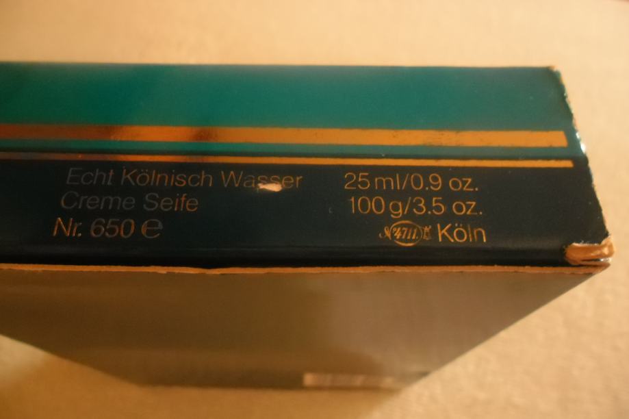 Kutija ima karakteristična (neznatna) oštećenja od protoka vremena, a dva vidljiva mala "uha" na rubovima sam zalijepila. Na stražnjem dijelu je očuvana mala etiketa od Parfumerie Schmitz-Rombach. Dimenzije kutije - visina 12cm, dužina 16,2 cm, širina 4 cm.