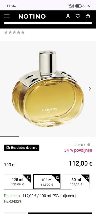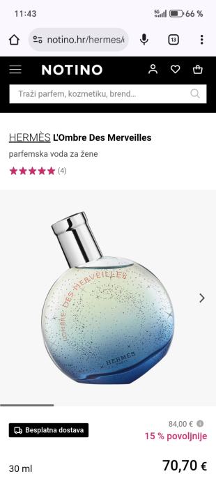 Prodajem 2 zenska parfema marke Hermes, povoljno, nekoristeni, originali, dobiveni za poklon, u pola cijene, manji od 30 ml prodajem za 35 eura, u Notinu je na popustu 70 eura, a veci od 100 ml za 55 eura, u Notinu na popustu je 112 eura.. mogu i pojedinacno, a mogu i zajedno, cijena za oba 80 eura, sto je stvarno povoljno, parfemi se nalaze u Zagrebu, Trnje..