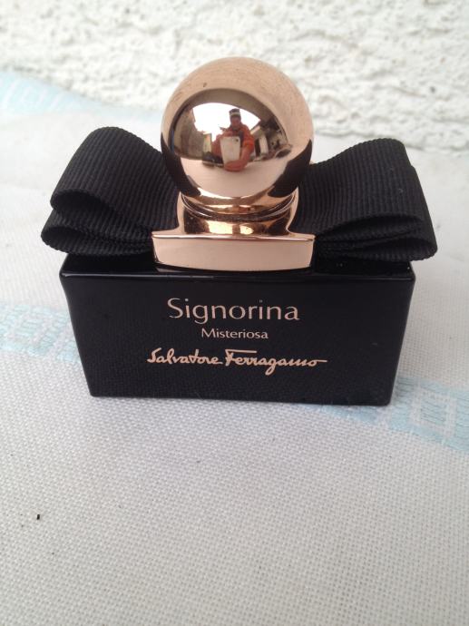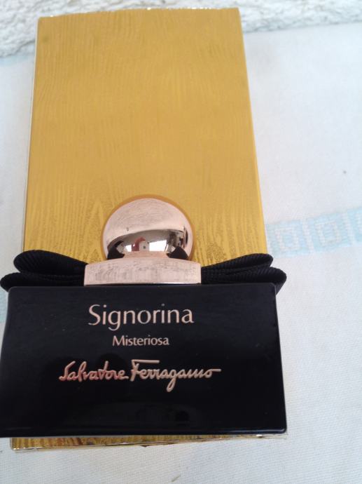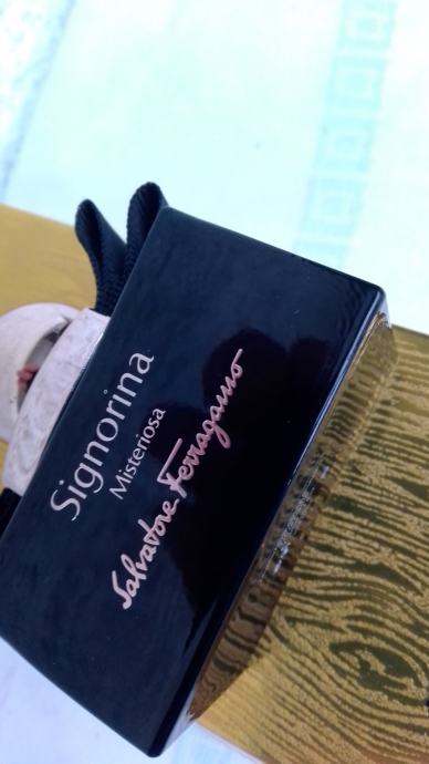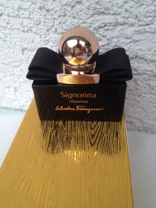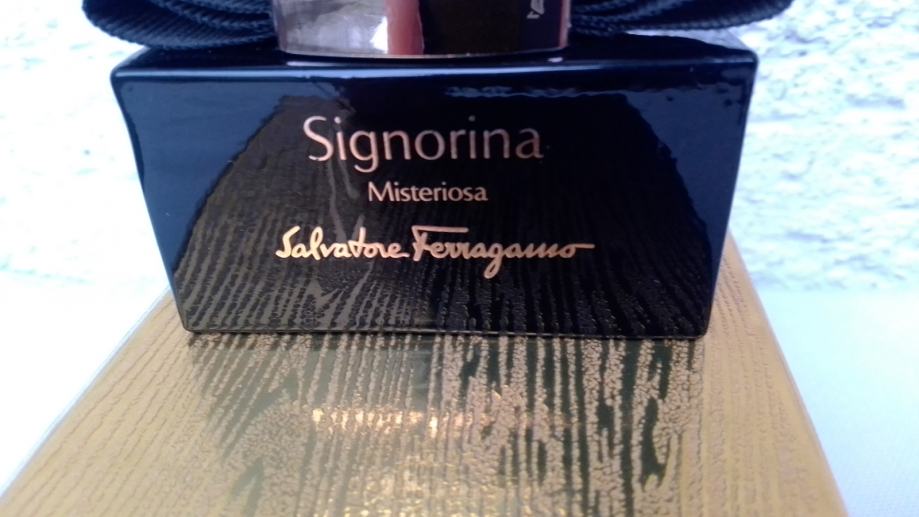 Salvatore Ferragamo " Signorina Misteriosa " ženski parfem - original, noćni, nepredvidivi i misteriozni book mirisa....gornje note divlja kupina i neroli - jedno od najljepših i najskupljih cvjetnih eteričnih ulja. Dobiva se iz voštanih bijelih cvjetova drveta gorke naranče, a ponekad se naziva uljem narančina cvijeta.....srednje note narančin cvijet i tuberoza - agava iz Meksika- Za proizvodnju parfema se koristi obična vrsta, jer ima bolju aromu, za 1 kg absoluta se koristi 3500 kg cvjetova. ,,bazne note daju crna ljuska vanilije, mliječni mouse vanilije i pačuli....potrošeno 5-6 špriceva.....