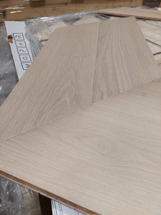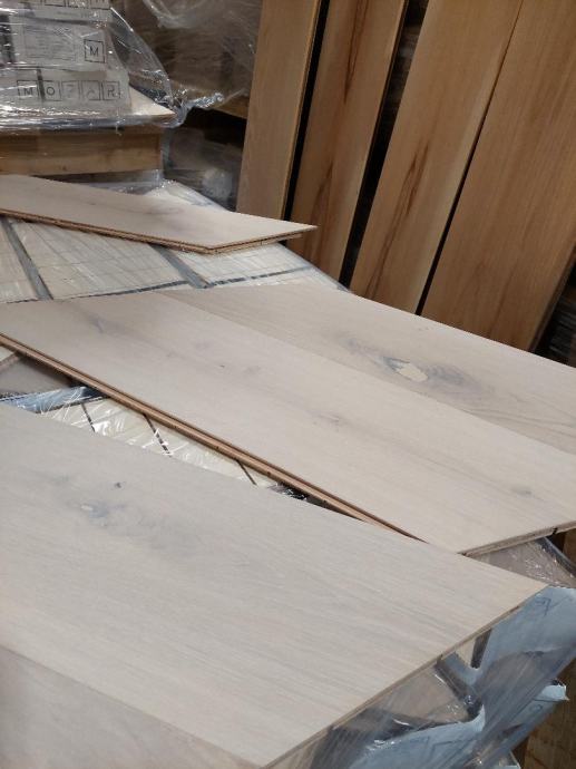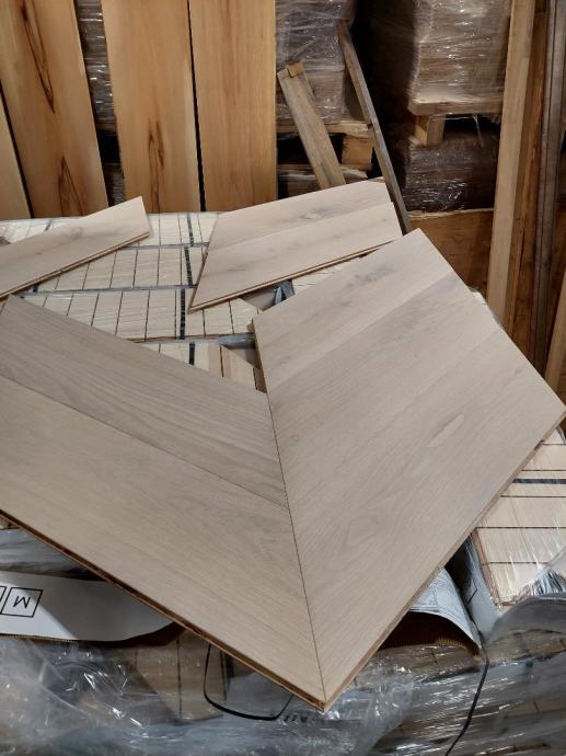 Prodaje se višeslojni seljački pod CHEVRON, četkan, lakiran, ,,castle'' efekt, pod kutem, desni i lijevi pola-pola, ukupno 350 m2