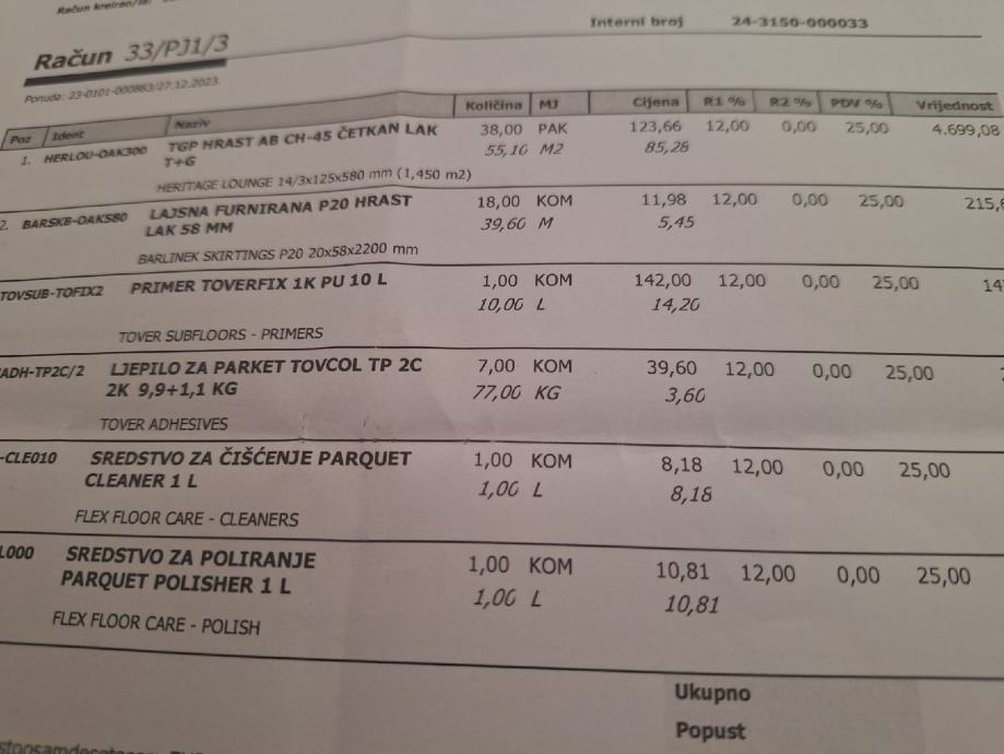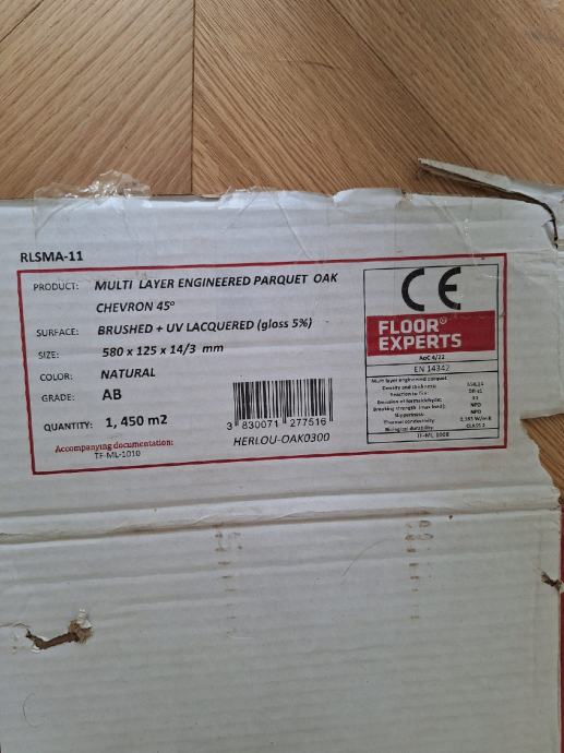 Parket je Hrast AB CH-45 četkan lak od 1,45 m2 svaki paket. Na računu piše koliko je plaćeno. Za oba paketa 100 Eura, a za kantu ljepila 20 Eura. Nalazi se u Šibeniku.
