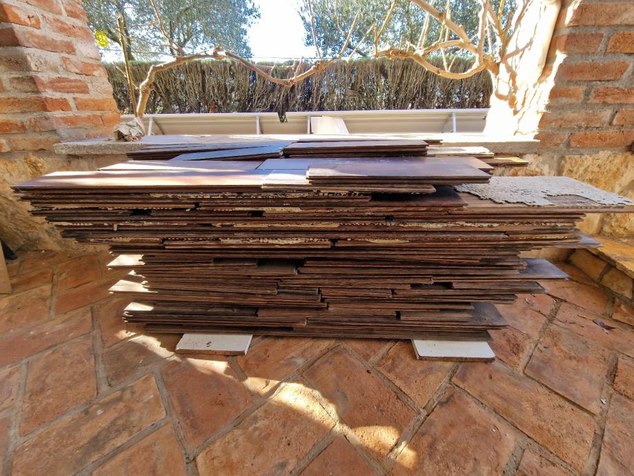 Cca 18m2 ukupno, od toga je 6m2 bilo postavljeno na ljepilu koje se može sastrugati ili izblanjati sa parketa, a 12m2 je bilo samo složeno kao laminat i nije ljepljeno, oboje je bilo postavljeno cca 2 godine u sobama koje se nisu koristile. Trenutna tržišna cijena od 60-80 eura/m2, prodajem po 17 eura/m2.
