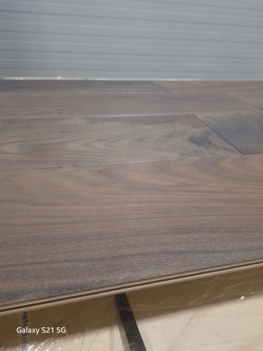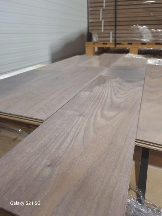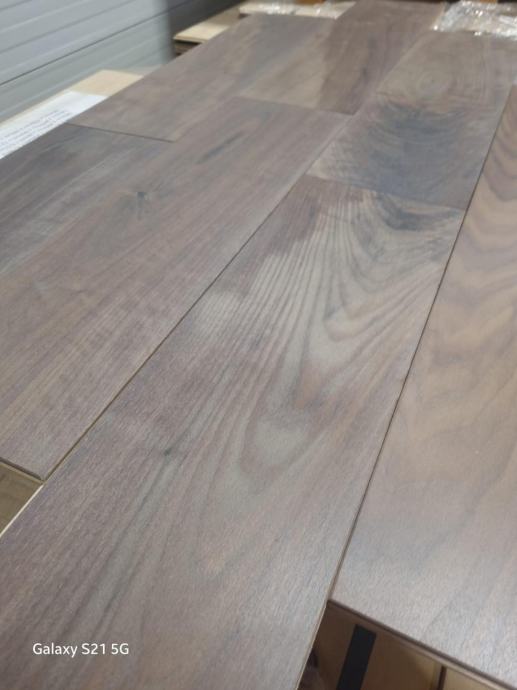 Prodaje se dvoslojni parket crnog oraha u širinama 70, 90 i 120 mm, 14 mm debljine, četkan, lakiran, mat lak.