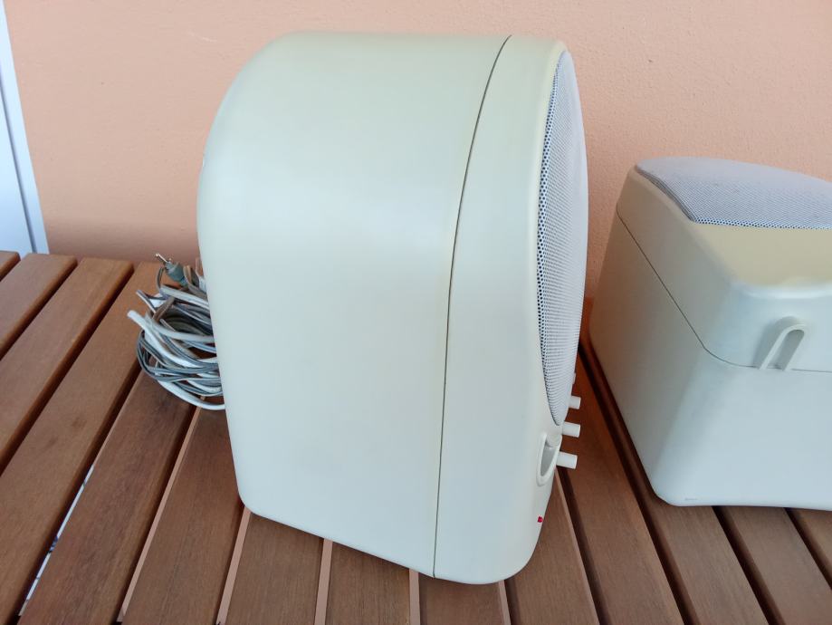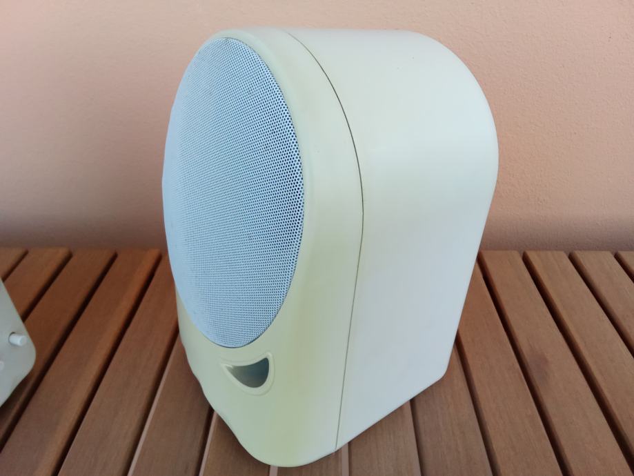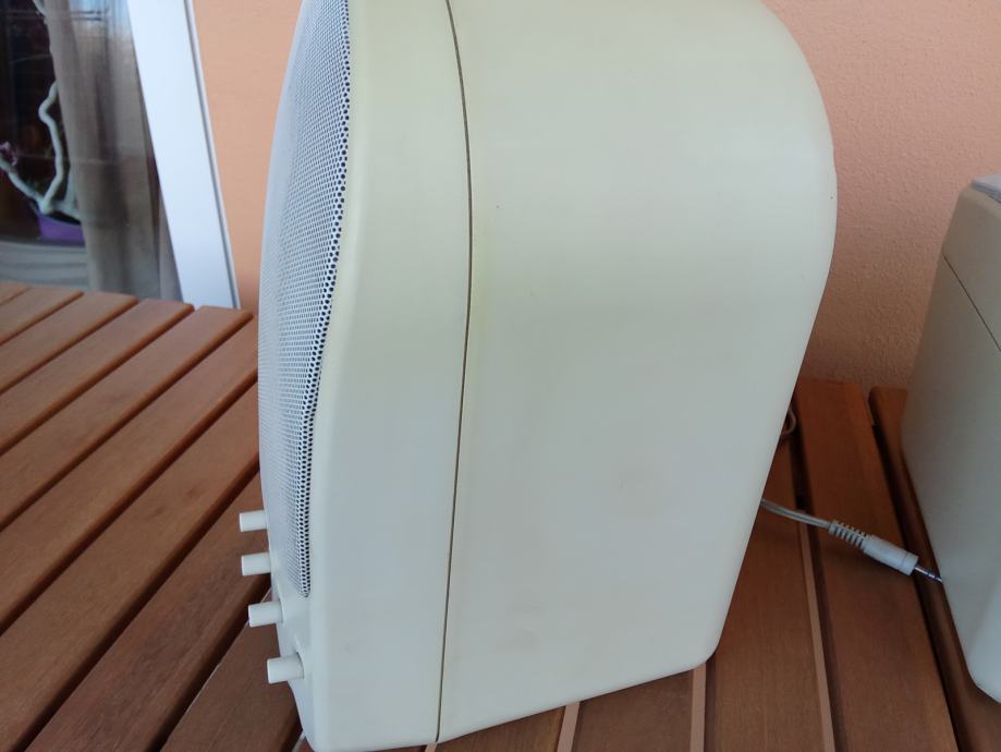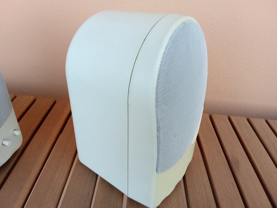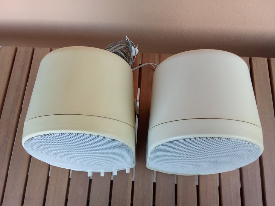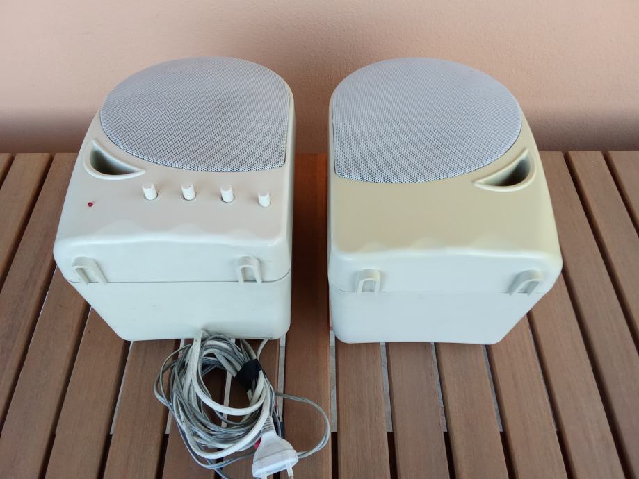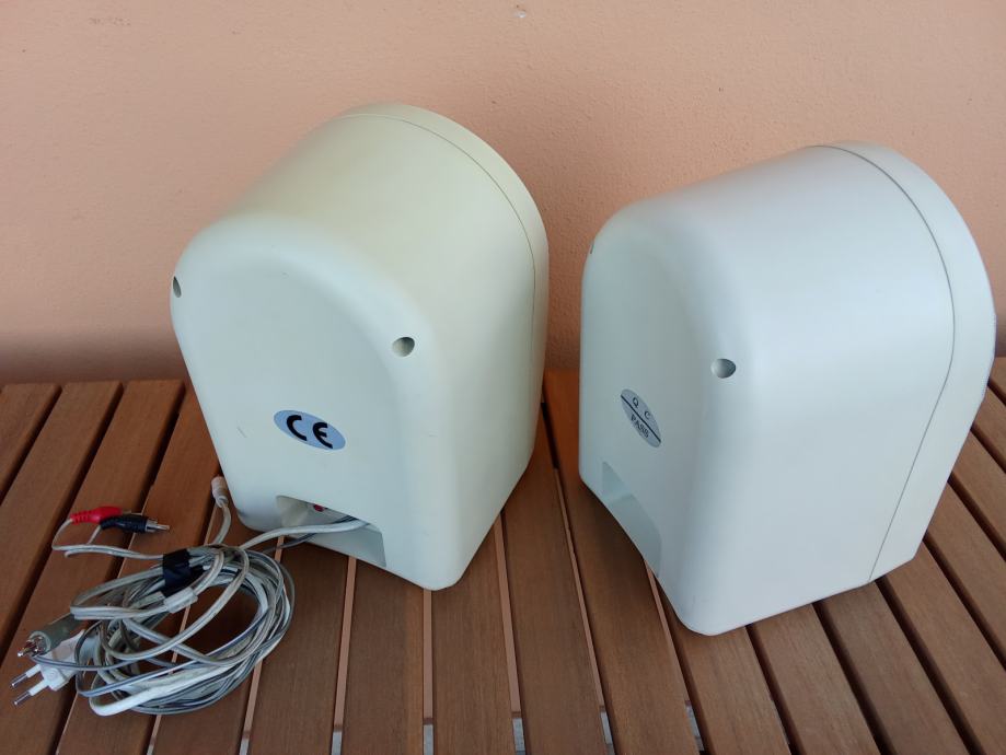 Ime proizvođača i oznaka modela nisu navedeni, kao ni karakteristike zvučnika. Nisam izmjerio kutije, učiniti ću to na zahtjev potencijalnog kupca. Širina svake kutije je oko 15 cm, dubina oko 15, a visina oko 25 cm. Čitavi su, bez pukotina, ali postoje neupadljiva površinska oštećenja, kao i razlike u boji površine nastale izravnim djelovanjem sunca na kutije. Fotografije priložene uz oglas prikazuju ovdje oglašene uređaje.