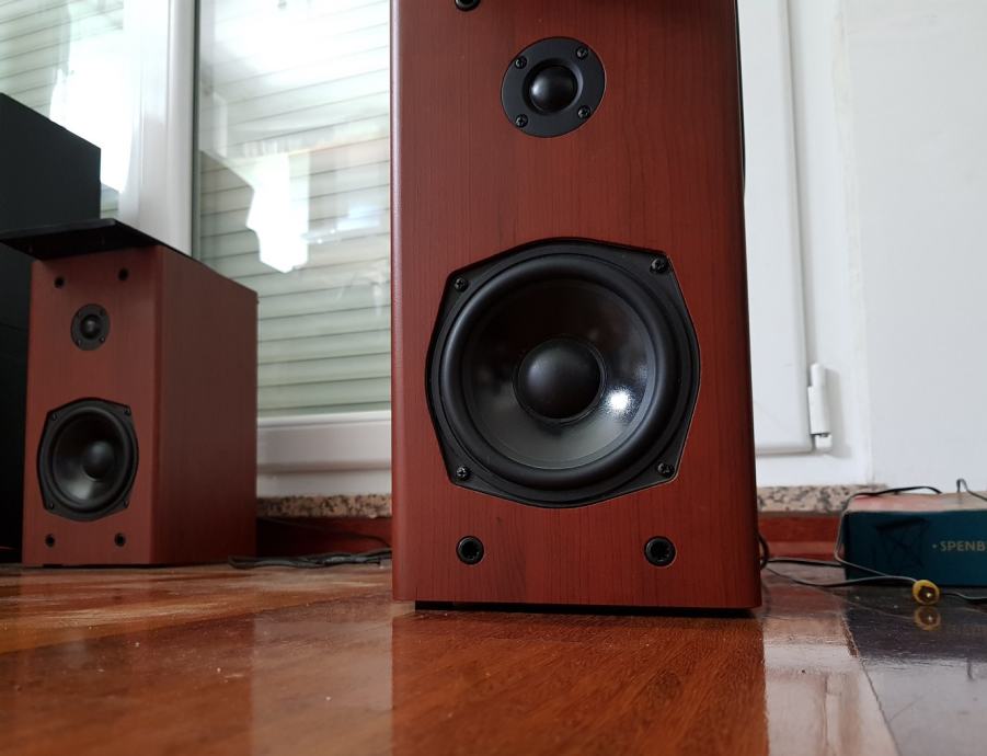Potenciometri za volumen, niske i visoke tonove, dok se na poleđini nalazi utor za slušalice. Spajanje je vrlo jednostavno. Činć kabel ide u glavni zvučnik, a iz njega ide 3.5 mm u računalo, mobitel, tablet ili neki drugi izvor zvuka.