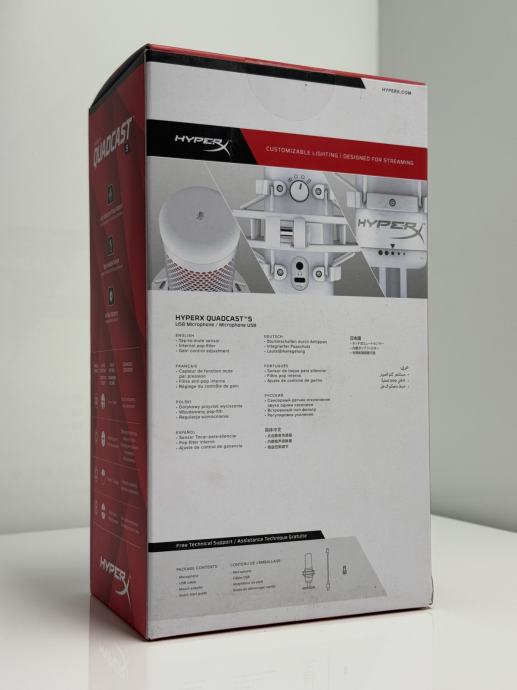 HyperX QuadCast™ S je USB kondenzatorski mikrofon koji izvrsno zvuči i izgleda izvrsno. Vrhunski zadivljujuće RGB osvjetljenje i dinamički efekti dodat će stil i štih svakom streamu ili postavci, a mogu se prilagoditi putem softvera HyperX NGENUITY. QuadCast S je sveobuhvatni mikrofon koji ima antivibracijski nosač koji pomaže utišati tutnjavu svakodnevnog života i ugrađeni pop filter za prigušivanje eksplozivnih zvukova. Trenutačno saznajte svoj status mikrofona pomoću LED indikatora i jednostavno dodirnite za isključivanje zvuka kako biste izbjegli nezgode pri emitiranju. S četiri odabrana polarna uzorka, ovaj mikrofon je pripremljen za gotovo svaku situaciju snimanja i ima kotačić za kontrolu pojačanja za brzu regulaciju ulazne osjetljivosti. Priloženi adapter za montažu odgovara veličinama navoja 3/8" i 5/8", kompatibilan s većinom stalka. QuadCast S je certificiran od strane Discord i TeamSpeak™ tako da možete osigurati da vaš mikrofon emitira glasno i jasno za sve vaše pratitelje i slušatelje, a također možete pratiti svoj mikrofon u stvarnom vremenu koristeći praktičan priključak za slušalice na stražnjoj strani mikrofona. Kompatibilan je s više platformi, tako da možete isporučiti kvalitetan izlaz zvuka bilo da se povezujete na PC, PS5™, PS4™ ili Mac®.