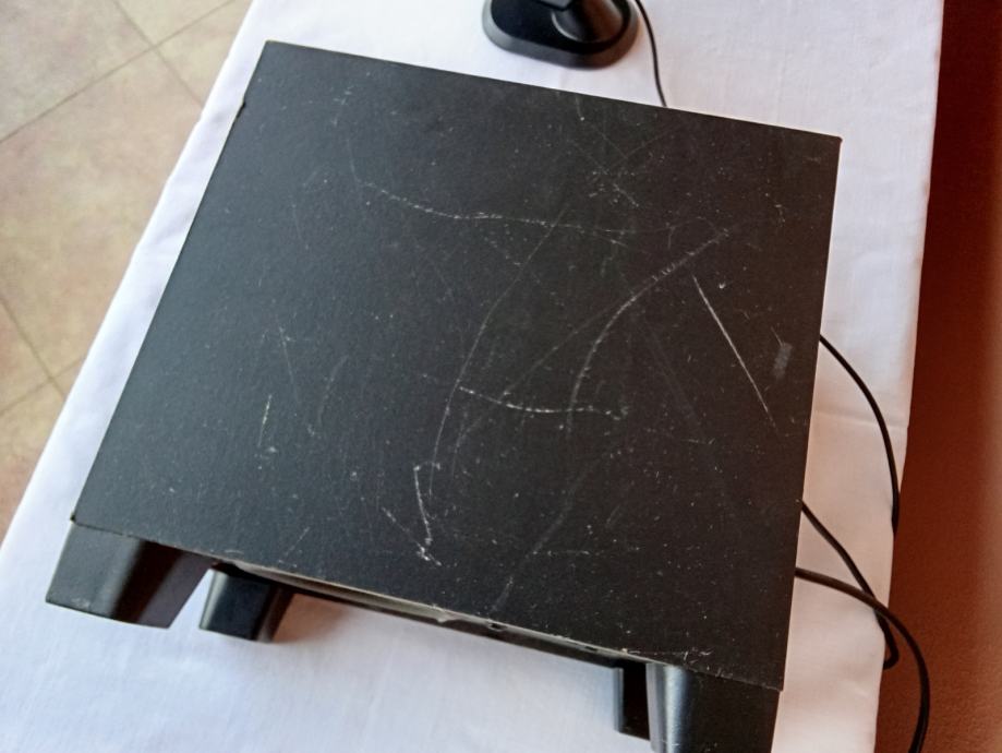 Ispravni su, proizvide normalan zvuk. Ovjes zvučnika subwoofera je zakrpan ljepilom, a na jednom od satelita nedostaje zaštitna mrežica. Postoje još neka površinska oštećenja, a sva su prikazana na fotografijama priloženim uz oglas.