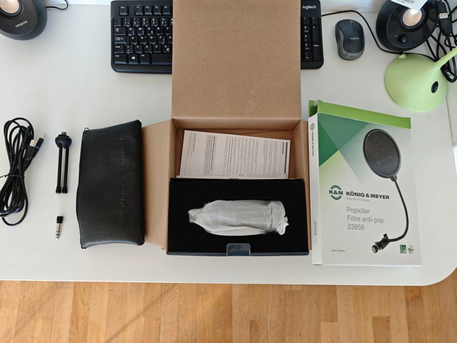 Mikrofon Audio-Technica AT2020USB+, cardioid condenser microphone, 16-bit, 44.1/48 kHz sampling rate.