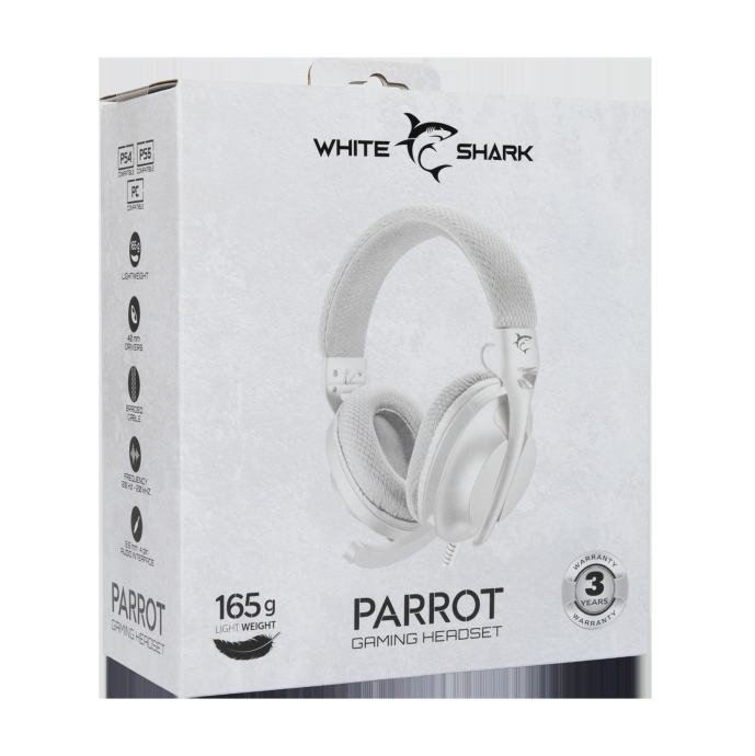 WHITE SHARK HEADSET GH-2440 PARROT slušalice nude izvrsnu audio kvalitetu i udobnost tijekom dugih gaming sesija. Ove stereo 2.0 gaming slušalice dolaze u elegantnoj bijeloj i sivoj boji, a dizajnirane su za korištenje s različitim uređajima poput PC-a, PS4/5, XBOX-a i MAC-a.Glavne značajkeFrekvencijski raspon od 20 do 20000 Hz, impedancija slušalica 30 Ohm, duljina kabela 1.8 m, te omnidirekcijski mikrofon s osjetljivošću od -38 dB.Prednosti za korisnikaUdobne slušalice s kontrolom glasnoće na samim slušalicama, pleteni kabel za dodatnu izdržljivost i lagana težina od samo 165 g omogućuju dugotrajno korištenje bez umora.Tehničke specifikacijeDimenzije slušalica 200x80x175 mm, dimenzije mikrofona 4x15 mm, osjetljivost slušalica 121 dB, sučelje 3,5 mm (4 pina).