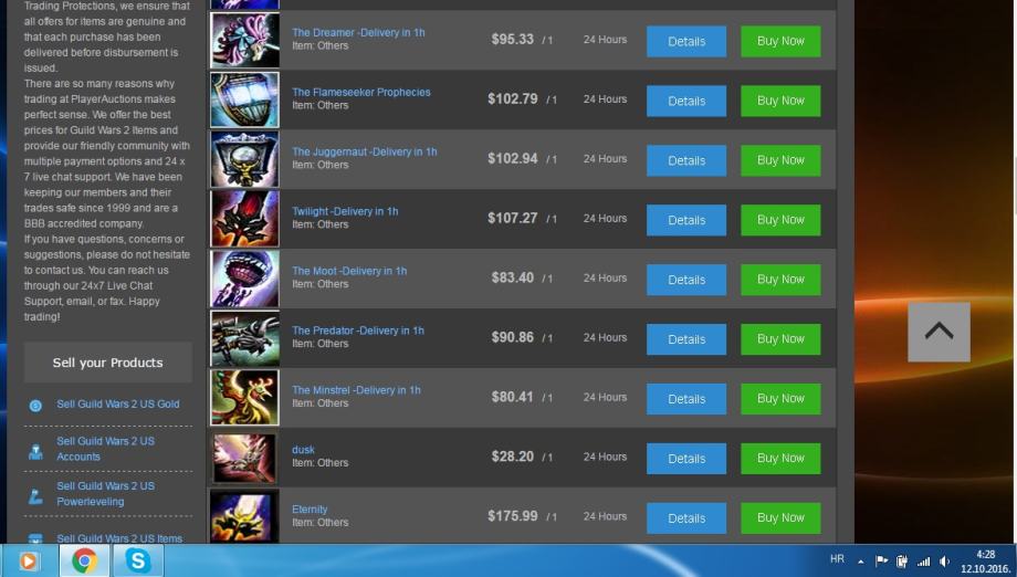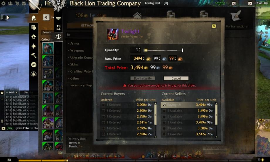 - TWILIGHT ( LEGENDARY GREATSWORD ), Cijena mu je 105$ ( 720 KUNA ) najmanje koju nudi svaka osoba koja ga prodaje preko interneta, a na Trading Postu u igrici moze se kupit trenutno najmanje za 3,494 sto je puno vise naravno.